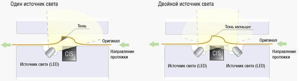 света, расположенными по обе стороны считывающего элемента CIS. Как показано, на